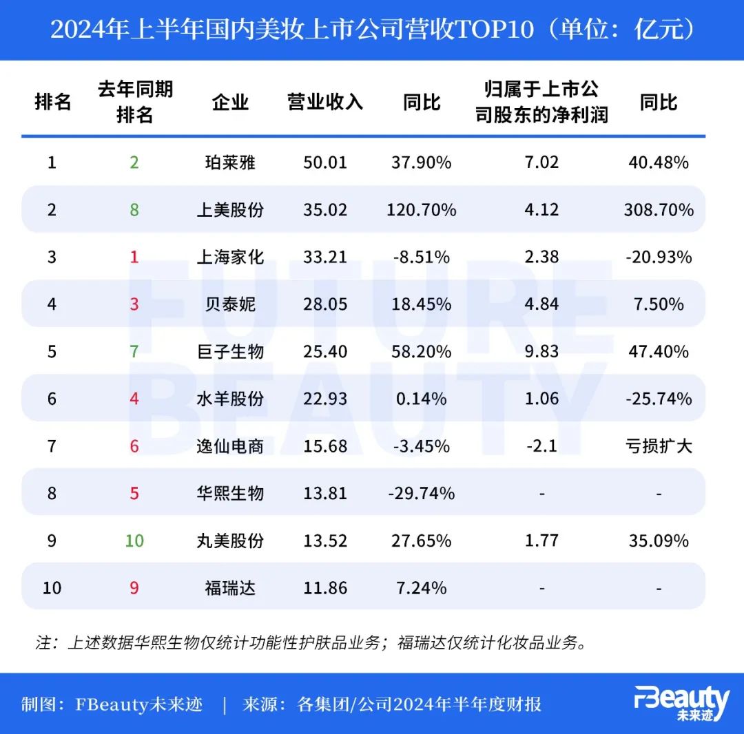 随着今年上半年各大国内美妆上市公司的财报陆续出炉,国内美妆十强的排名也浮出水面。