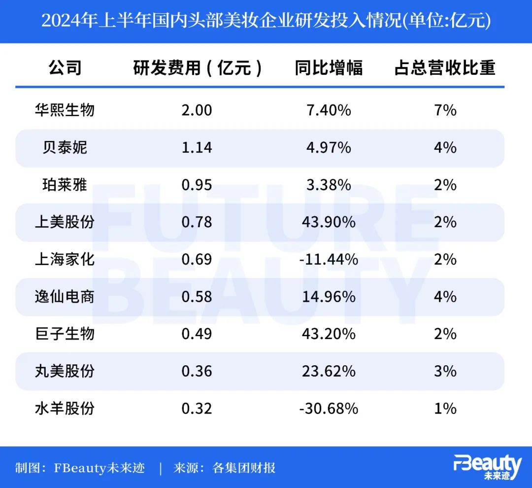 梳理上半年国内头部美妆企业的研发投入情况,不难发现,大部分企业都在继续增大研发费用的投入。珀莱雅的研发费用仅次于华熙生物和贝泰妮,而上美股份、巨子生物和丸美股份研发费用的同比增幅均超过两位数,分别为43.90%、43.20%、23.62%。