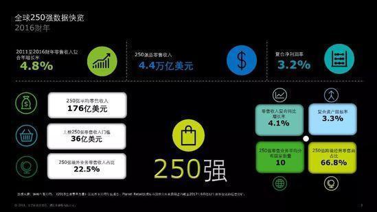 这份报告的一大重磅看点是其《全球零售力量250强》榜单情况:最新报告显示,2016财年(截至2017年6月的财政年度),全球250强零售商共创收4.4万亿美元,复合增长4.1%。