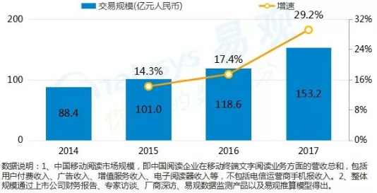 移动阅读方面,截至2017年,中国移动阅读市场规模已达到153.2亿元,增速达到29.2%。随着经典出版文学和网文阅读的持续升温,IP产业链收入将成为阅读市场规模增长有利的推动因素,未来行业将保持稳健增长。
