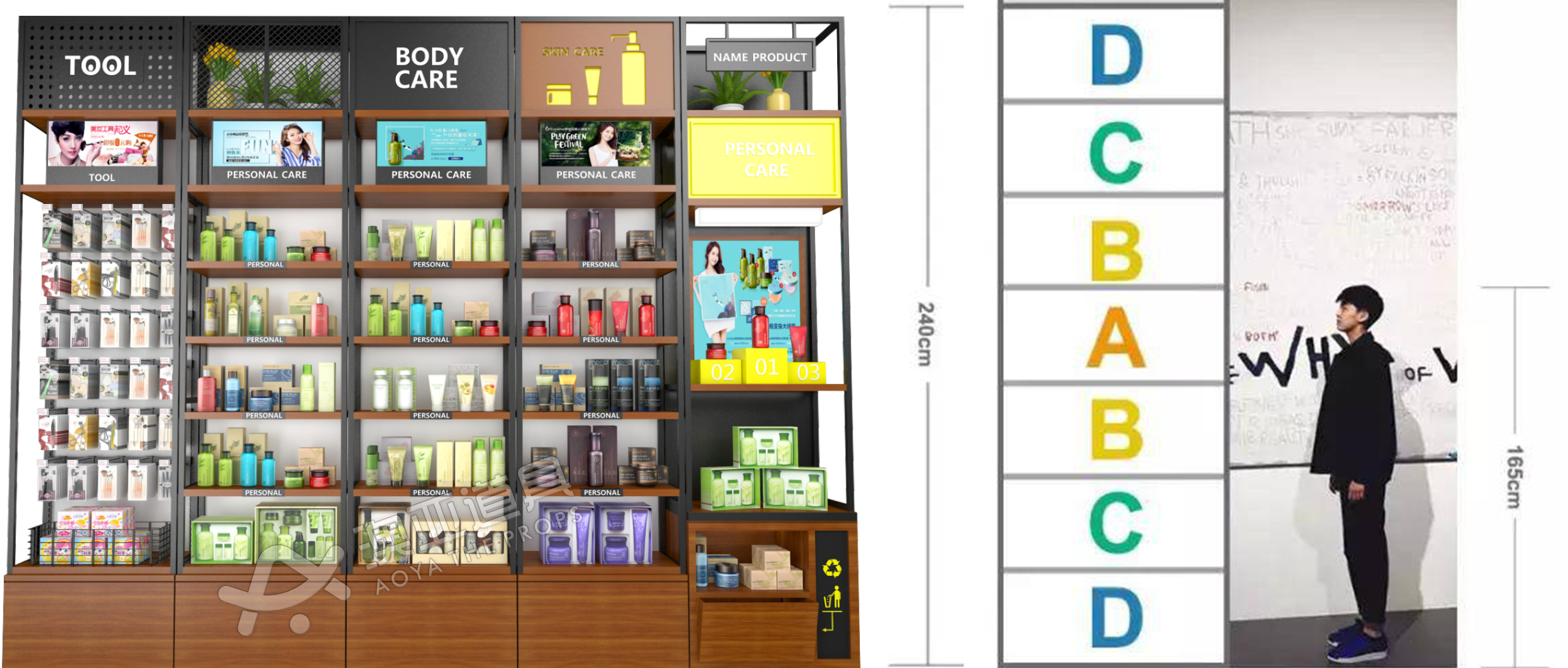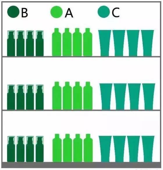 要说明的是:A上面的B位置,从视线上来讲应该也为A,但因高度需要人抬手过肩拿取,所以只能以B论处。另外,每个店的背柜的层板的高度和数量不一样,ABCD的排列,要根据自己店内实际情况来区分,以上只是模型参考。