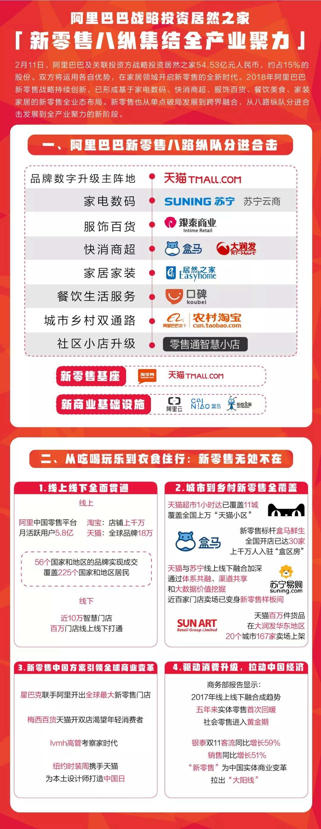 2月11日,北京居然之家投资控股集团有限公司(以下简称“居然之家”)与阿里巴巴集团共同宣布达成新零售战略合作:阿里巴巴以及关联投资方向居然之家投资54.53亿元人民币,持有其15%的股份。双方将运用各自优势,在家居领域开启新零售的全新时代。
