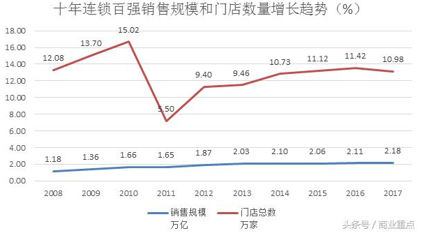 十年连锁百强销售和门店增长趋势