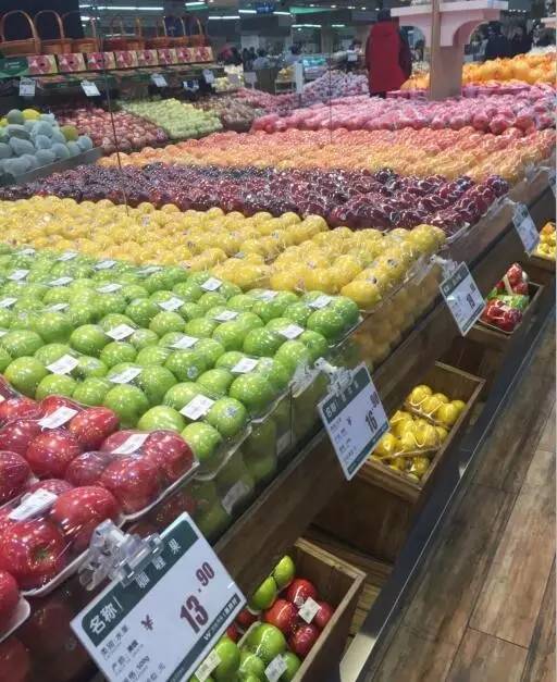 水果的陈列不在追求堆山,平平陈列加上相应的镜面照影或有坡度的货架同样能勾起人的购买欲。