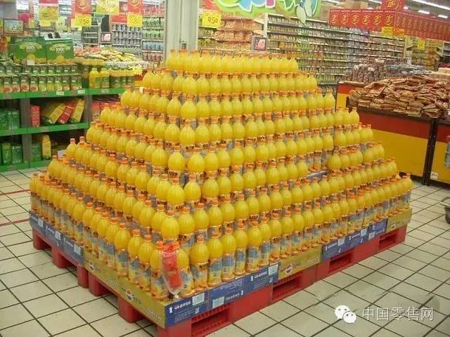 堆箱陈列:注意垫底的稳固性,可以使用交叉堆法,POP及产品包装正面均应面对消费者,高度适宜,容易拿取。