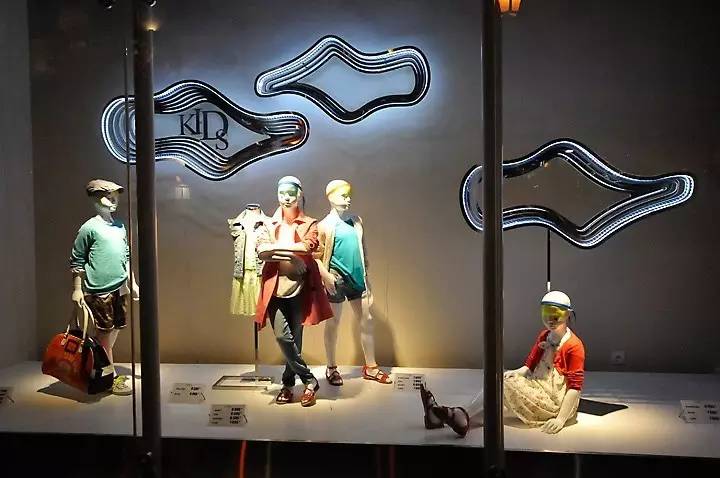橱窗基本上是主题化,十分擅长使用模特和道具。模特无论从姿势、种类、位置和形态都各不相同,从而强调服装的多样性和搭配。