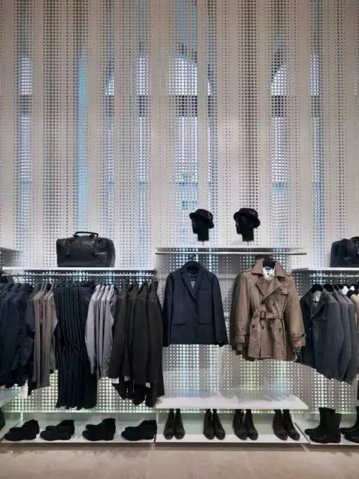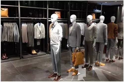 男装的展示区域分为正装区和休闲区,大部分为中性色和明度较低的颜色,配饰的搭配展示贯穿始终。