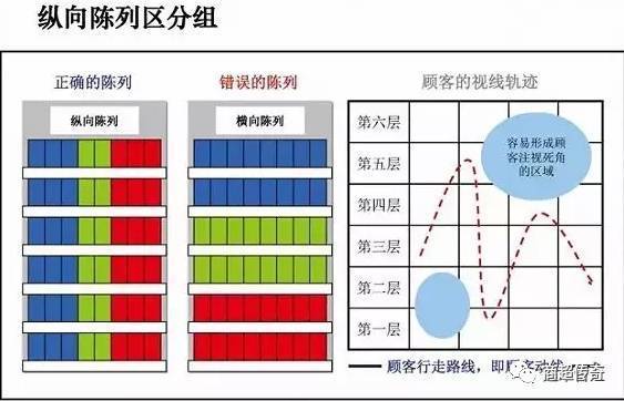 纵向陈列较横向陈列更符合顾客视线轨迹的运行,能最大限度地提升顾客对排面的关注,避免顾客视线死角的形成。如下图:
