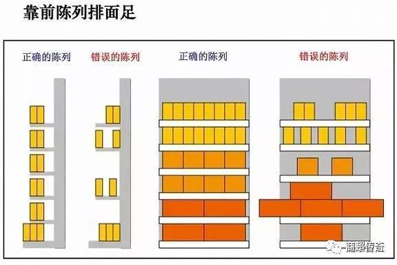 与摆放整齐的目的一样,靠前陈列能较好地展示商品形成量感和美感,充分利用陈列工具来增强陈列效果。如下图所示: