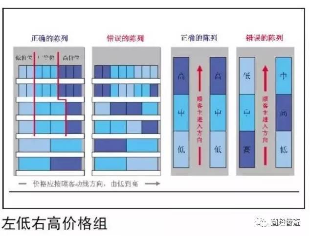 一般来说,商品陈列应依据顾客的动线方向,依次陈列低价位、 中价位、高价位的商品。特别是在顾客进入的方向陈列低价位的商品,有利于门店低价形象的形成。