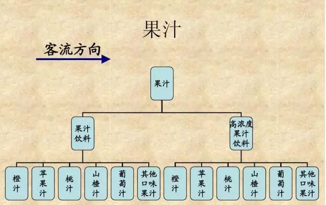 首先按果汁含量30%以下的为果汁饮料,含量在30%以上的为高浓度果汁饮料分别陈列,再按照橙汁、苹果汁、桃汁、山楂汁、葡萄汁及其他口味果汁陈列。同类同口味商品品牌集中陈列,小规格在上,大规格在下。最下层可作为整箱陈列。