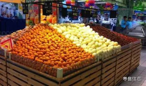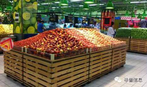 苹果陈列,两层,既体现量感,又控制损耗,所有苹果绝对是一个一个摆上去的,可见要求之高。