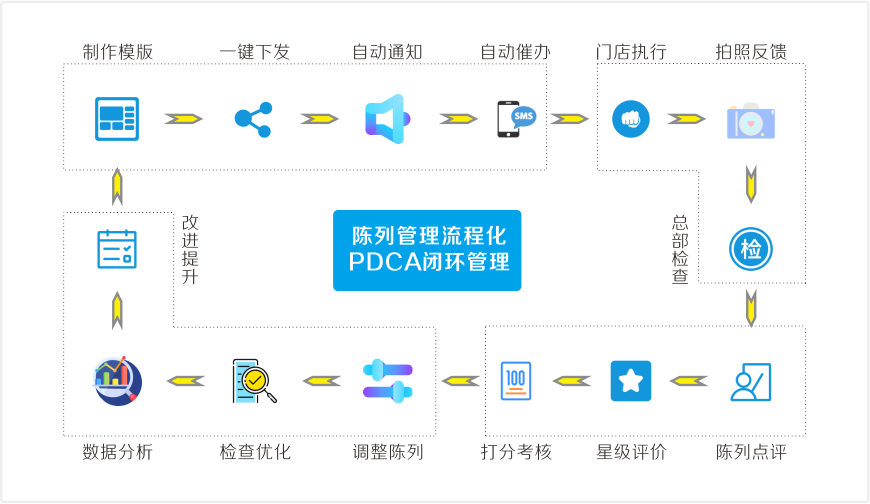 以陈列管理为核心,减少碎片信息不统一,让总部及门店执行标准流程化PDCA闭环管理,形成可持续的优化体系