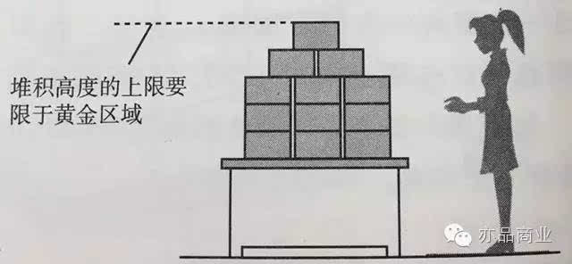 堆积时,要展示商品正面且高度低于顾客的黄金区域,即便于拿取又能保持其稳定。堆积容易倒塌的商品时,为增强其稳定感,要像砌砖一样交错堆积。