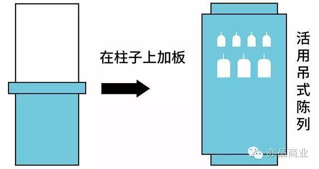 墙面柱总会导致卖场陈列的不连续,首先根据柱子的厚度,在其左右放入陈列架,然后在柱子上加板,用吊式陈列摆放与两侧关联的商品。
