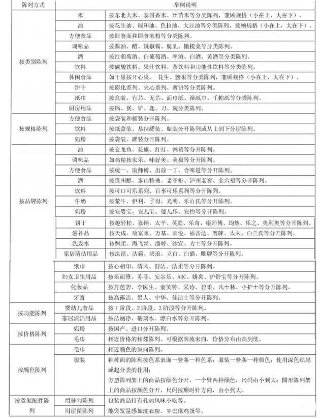 分类陈列可按类别、功能、规格、颜色、品牌、价格等分开陈列,具体见附表。