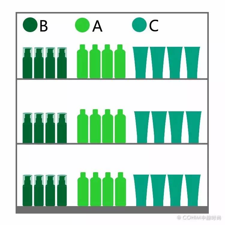要说明的是:A上面的B位置,从视线上来讲应该也为A,但因高度需要人抬手过肩拿取,所以只能以B论处。另外,每个店的背柜的层板的高度和数量不一样,ABCD的排列,要根据自己店内实际情况来区分,以上只是模型参考。