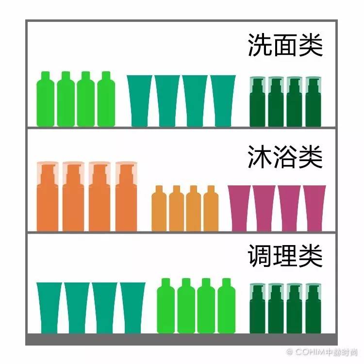 而中岛柜因为柜台自身的因素,会以品类陈列为主。不同品牌的同一品类聚集在一块,更方便顾客同类比较。要注意的是,并非同一品类一定要摆一排,以横向扎堆是主原则,但也可以穿插的以竖向扎堆为辅助,不要死板。