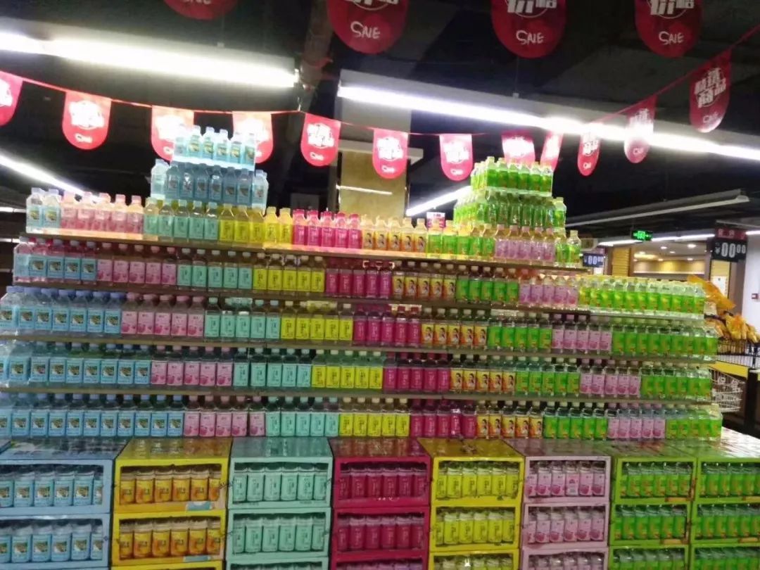 3.异型:一般的堆头形状是方形的,如果堆头的位置不是很好,为了增加产品的表现力、吸引消费目光,经销商可以根据自己产品的包装情况和品牌推广的需要,摆放不同形状的异型堆头。