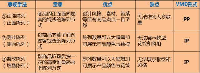 IP : 单品提案,满足顾客试穿或购买所需要的某件产品的容量陈列。
