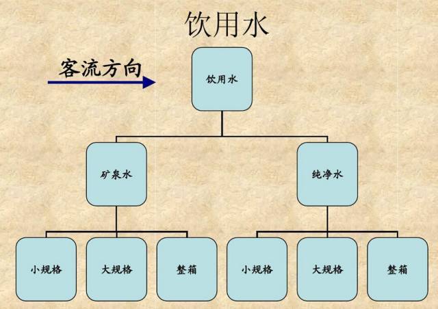 碳酸饮料先按口味即:可乐味、柠檬味、橙味及其他口味分别陈列,在每个口味中品牌相对集中陈列,即上层为听装,中间为小塑,下层为大塑,最底层为整箱陈列。