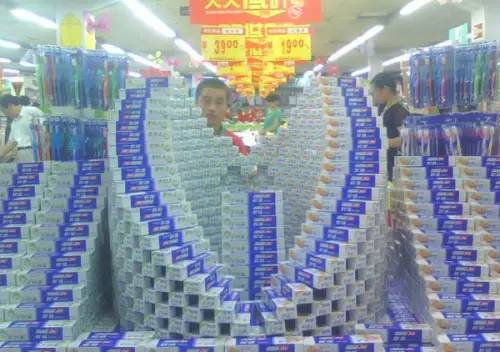 这样的陈列就是最基本的陈列,只是很简单的货物的摆放,分类。而这样的陈列也是现在大多数终端门店的样子,生活的小区,生活区周围小超市,学校,工厂小卖部,自营的便利店的陈列都是这个样子。消费者也都是周边生活的人群,也只有在购买必备的用品,方便性才吸引周围的消费者。