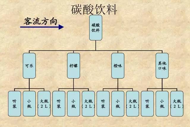碳酸饮料先按口味即:可乐味、柠檬味、橙味及其他口味分别陈列,在每个口味中品牌相对集中陈列,即上层为听装,中间为小塑,下层为大塑,最底层为整箱陈列。