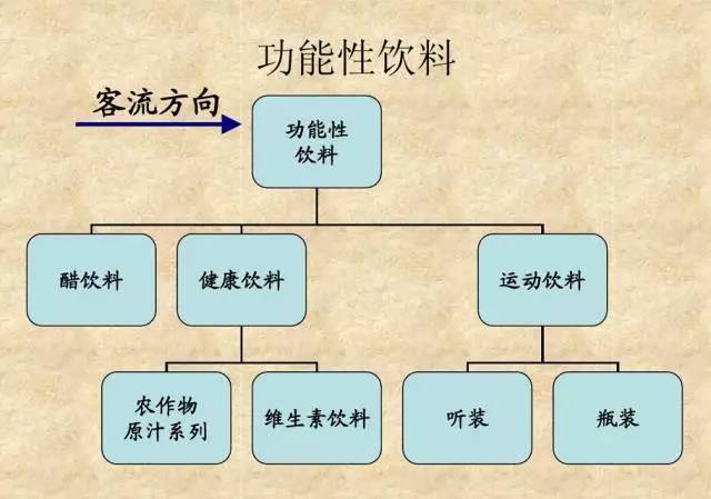 功能性饮料按照醋饮料、健康饮料及运动饮料三类分别陈列,同类商品品牌集中陈列,听装在上,瓶装在下,小规格在上,大规格在下。最下层可做整箱陈列。