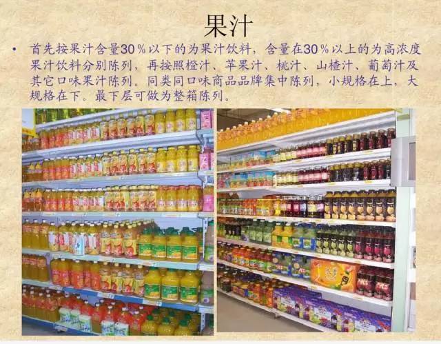 首先按果汁含量30%以下的为果汁饮料,含量在30%以上的为高浓度果汁饮料分别陈列,再按照橙汁、苹果汁、桃汁、山楂汁、葡萄汁及其他口味果汁陈列。同类同口味商品品牌集中陈列,小规格在上,大规格在下。最下层可作为整箱陈列。