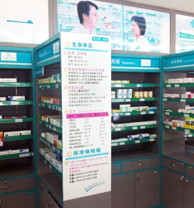 蓝绿色凹凸柜组如何填补审美空白?通过一张简单实用的健康建议表,不仅能播撒健康知识概念从而收获人气,更能起到“开门见山”的效果将顾客引入柜组当中挑选药品,从而弥补凹凸柜组的不足之处。