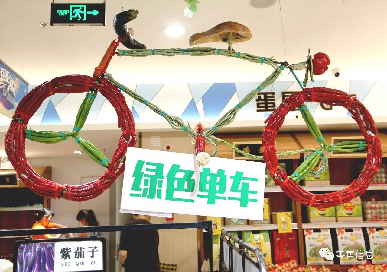 亮点:生鲜商品展示有创意,吸引顾客眼球,传递绿色环保理念;