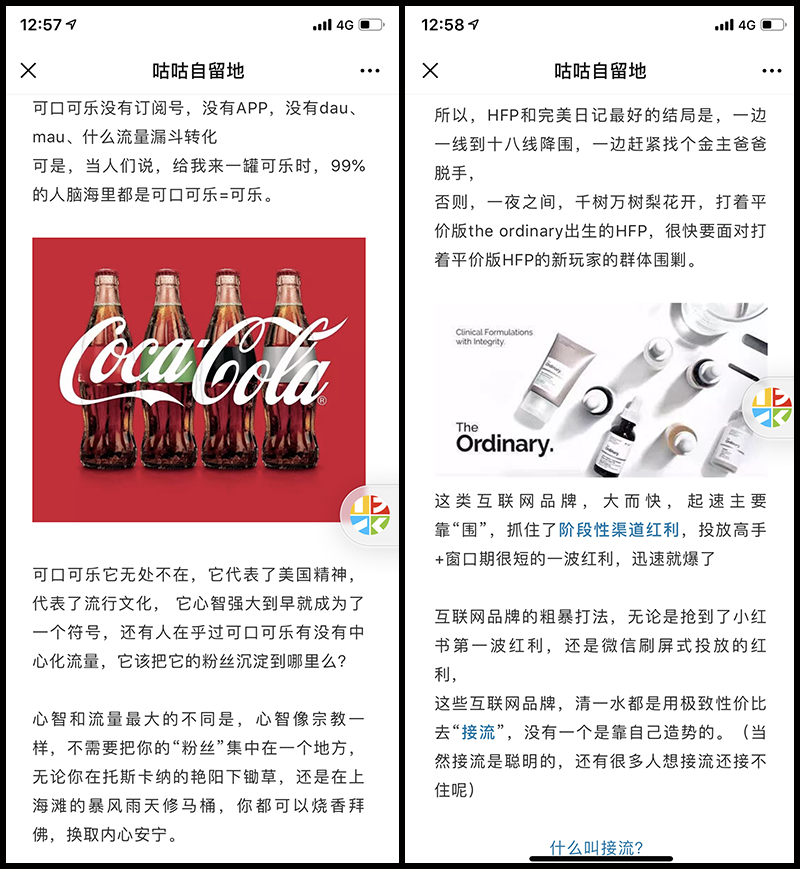 知名KOL于小戈在“咕咕自留地”把雕爷狠狠地批了一通,看看标题就知道她的观点了:《互联网老炮懂什么新消费?先把品牌和厂牌分清楚再说吧》,言下之意,就是“不管你阿芙,还是HFP、花西子,全是“厂牌”好吧?!你们离真正的品牌还远的很哪!什么叫真正的品牌,就是可口可乐、Nike、Dior、CHANEL这些,好好学学吧!敢问你知道铂金包么?这个都不知道还敢说自己是品牌,太幼稚了吧!”