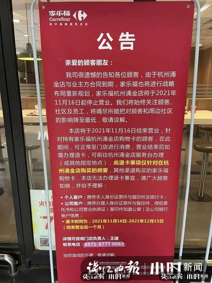 一步入超市,就看到了一旁的公告,上面写着:由于杭州涌金店与业主方合同到期,家乐福也将进行战略布局重新规划,家乐福杭州涌金店将于2021年11月16日起停止营业。