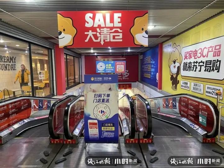 超市电扶梯处也有大清仓的提示,超市里顾客不多,有些冷清。