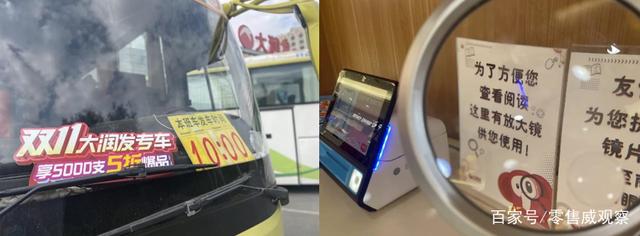 ▲门店外,大润发为中老年客户提供接送专车;门店内,大润发提供放大镜