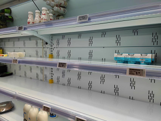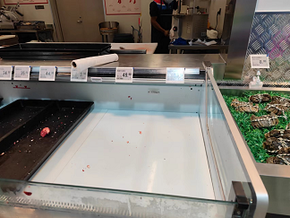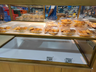 首先是缺货严重。中午两点左右门店中已经有许多货架上已经出现了无货的情况,并且长时间无人补货,据壹览商业观察无货柜台至少在5个以上。以鲜食烘焙区为例,从鲜食烘焙区的标签可以看到鲜食烘焙应当供应8-9种不同类型的产品,但是在烘焙区多数的标签都找不到商品,只有如黄油可颂、蛋挞等几种烘焙食品在供应,鲜食烘焙区的管理也不如人意。