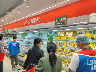 进入超市后,第一眼看见的是由自助收银台与人工收银台组成的收银区,在收银区最右侧便是超市卖场区的入口。虽然并不是仓储会员店但在入口处还是有许多超市员工正在举牌让顾客免费入会。