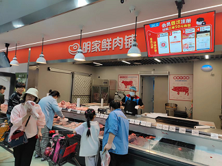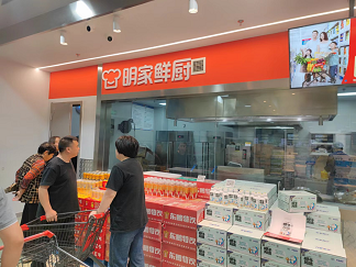 进入到卖场后,从货品摆放来看,明康汇的货品摆放采取的是仓储超市常规的大批量摆放,一般承载商品的主要是明康汇自己设计的PDQ展示盒,而对于整包装的大批量商品则采用的是直接码放。整个卖场区共分为水果、蔬菜、米面粮油、日常用品等数十个常规专区,另外还有如明家鲜厨、明家烘焙、明家鲜渔铺、明家鲜肉铺、明家鲜肉铺、明家烘焙坊、明家蔬果七个明家特色食品专区。