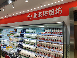 其次是商品摆放错乱。比如明家烘焙坊应当摆放的是烘焙产品,但在货架上却摆满了乳制饮品。