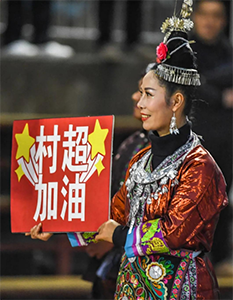 1月7日,一位村民手举“村超加油”的标牌 新华社记者 陶亮 摄