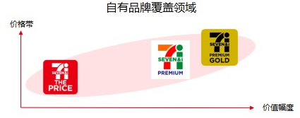 7-11的自有品牌按照价格带和商品价值幅度,分为三级:7the price(2017年细分,定位折扣价、优品)、 7premium(2007年创建、定位为基价、每天想吃)、7 premium gold(2010年开始,定位为高价、专业共享),此外,还有延伸的短期生鲜系列7premium fresh(定位为低价、新鲜放心)、7cafe、生活方式系列7premium life-style(定位为低价、休闲服)。具体分布方法及业务结构尚未深度披露。