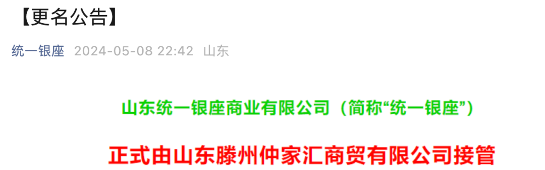 与此同时,统一银座也在微信公众号发布公告称,山东统一银座商业有限公司正式由山东滕州仲家汇商贸有限公司接管。