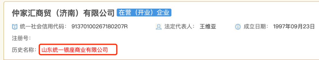 紧接着,5月7日,山东统一银座商业有限公司已变更为仲家汇商贸(济南)有限公司,该公司的法定代表人变更为王维亚,新增股东为滕州仲家汇商贸有限公司,持股比例100%。
