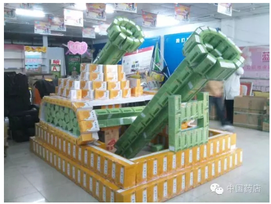 面对这幅陈列作品,心里只有两个字——震撼。能通过一些小小的药盒,组成如此令人叹为观止的作品,殊为不易。其间架结构,大规格制作,足够引起进店之顾客围观。对于门店、药品的品牌形象宣传可谓下足了功夫。