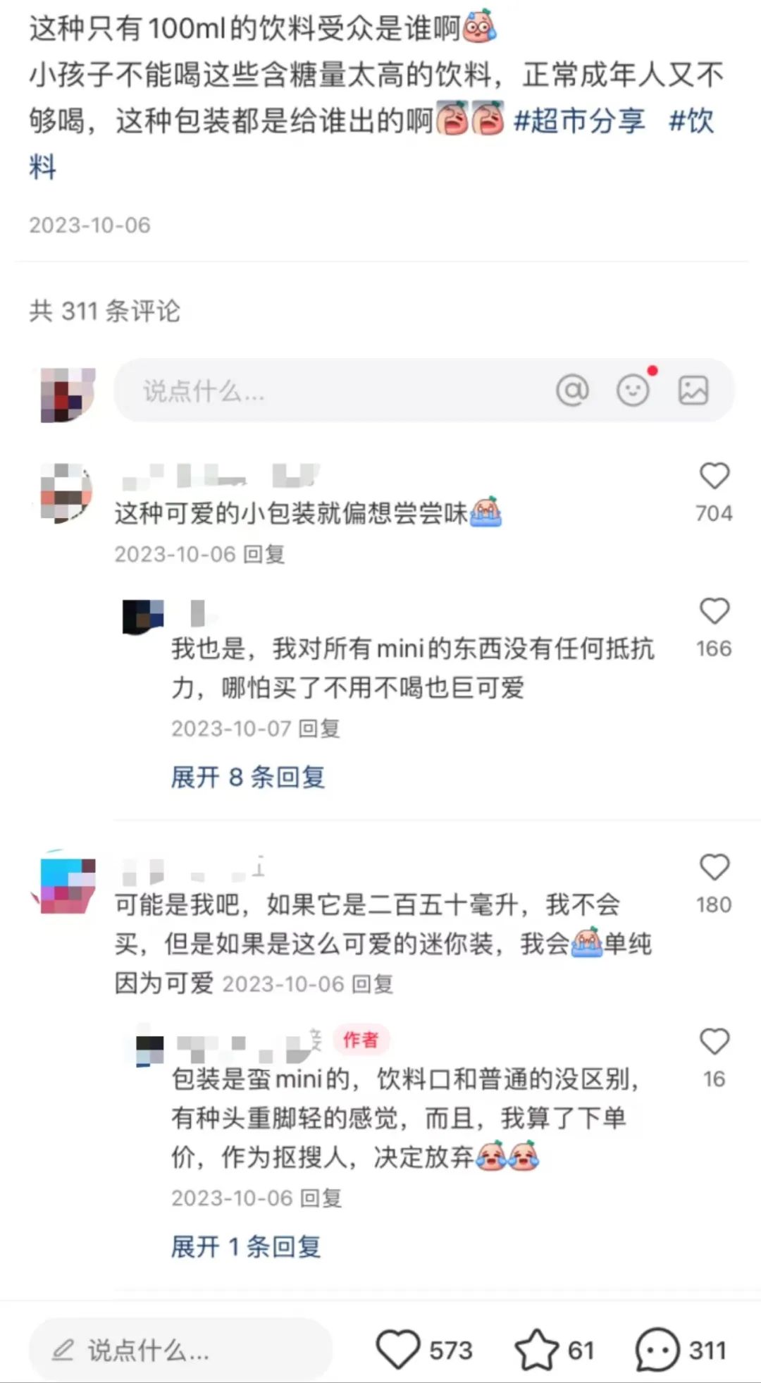 出品/FBIF食品饮料创新 作者/Abby 万万没想到,饮料包装的大与小,竟然成了年轻人的“社交货币”。 在微博,关于饮料大包装话题屡上热搜。仅#1L包装为何成为年轻人的社交货币#这一话题,截至发稿前,阅读量已经超过了6900万,其他相关话题阅读量也超百万。 在小红书,小包装有着较高的热度。如小包装的东方树叶颇受欢迎,甚至有网友将335ml的东方树叶DIY变成更小包装。这篇以“全网最小的东方树叶”为主题的贴文,就有3万个点赞量,1900多个收藏以及1000多条评论。 网友将335ml的东方树叶剪接更mini后,在小红书引发热议 图片来源:小红书@momo 还有网友灵魂发问——100ml的饮料受众到底是谁?不少人评论:“这种可爱的小包装就偏想尝尝味”“哪怕买了不用不喝也超可爱”…… 大、小包装高热度下,更多品牌开始把包装变大或变小。在FBIF2024食品饮料创新论坛上,凯度消费者指数大中华区总经理虞坚就曾表示,“超值装产品和小包装产品正驱动整个饮料行业的增长。” 据尼尔森IQ《2024中国饮料行业趋势与展望》显示,600ml-1249ml的大即饮成为饮料行业近年来的新增长点。 近几年,无论是传统品牌还是新兴品牌,也的确在包装规格上做文章,除了推出500ml左右规格包装外,还陆续推出1L左右的大包装或300ml左右的小包装。 如东方树叶,除了500ml的包装外,还推出了900ml以及335ml的包装; 335ml、500ml、900ml的东方树叶 图片来源:小红书@Candy陈 脉动也出现1L的大包装以及400ml的小包装。品牌甚至还在1L的大包装上“整起了活”,瓶身印上了“好~好~好~大”的字样。 “好~好~好~大”的1L脉动 图片来源:小红书@喵 此外,还有元气森林、果子熟了、美汁源、柠檬共和国……除了包装饮料外,包装规格的变化在新茶饮、酒类甚至休闲零食上也十分常见。 为什么这些品牌们开始在包装规格上变大或变小呢?包装规格的变化背后,又对应着什么样的市场需求呢? 01 饮料包装,变大或变小 饮料大、小包装并不是一件新鲜事。但近几年,消费者对大、小包装的关注度越来越高,为了迎合消费者的需求,不少品牌开始包装规格“下功夫”。 东方树叶是比较典型的例子。 2011年,农夫山泉推出无糖茶——东方树叶,每瓶500ml。2019年10月,东方树叶上市8年后首次推出335ml的mini包装。 图片来源:小红书@啤酒泡泡 2023年,年轻人对大包装饮料关注度越来越高。东方树叶于当年年初在天猫旗舰店上线了900ml的大瓶装。到今年,东方树叶900ml大瓶装已经在线下渠道铺开,甚至占据了货架C位。 FBIF走访多地发现,900ml的东方树叶无论是在大型商超还是在乡镇零售店都随处可见。 湖北某五线超市第三排货架摆上了茶π和东方树叶大瓶装 图片来源:小红书@一颗小蒜苗 除了东方树叶之外,还有不少农夫山泉旗下饮料的包装都在变大或变小,如茶π、水溶C100、维他命水、农夫果园等。 元气森林同样如此。2018年,元气森林发布了其经典产品——苏打气泡水。彼时,这款气泡水的规格还是480ml。2020年5月,元气森林就推出了5款不同口味的mini罐气泡水,每罐200ml。此后不久,280ml的小瓶装、1.25L的大瓶装陆续上市。 元气森林推出的200ml罐装以及280ml瓶装苏打气泡水 图片来源:小红书@是祖祖呀 除了苏打气泡水之外,元气森林旗下其他产品也在近几年出现了大、小规格包装,如2019年上线每瓶450ml的元气森林乳茶,,上线一年后就推出了300ml的mini乳茶;2023年全面铺市的新品——冰茶包装为450ml。半年后,元气森林就宣布推出900ml的包装。 近年来包装变大、变小的产品还有很多,如汇源在2022年推出2L大容量桶装新品;东鹏饮料2023年1月上线新品“补水啦”之时,在包装规格上就同步推出了555mL与1L两种容量;有丛气也在今年上线了2L大包装。 2L包装的有丛气产品 图片来源:有丛气官方小红书 其实,1L左右的大包装以及300ml左右的小包装并不是近几年才出现的。过去,如康师傅、统一、可口可乐、百事可乐等品牌早在2019年之前就已经不同规格的包装。 对比过往可以发现,有一个明显的变化是,大、小包装的饮料再仅限于果汁、碳酸饮料,而是开始走向无糖茶、功能性饮料、果茶等各种细分品类的饮料上。 大包装的热度,不仅仅限于包装饮料。新茶饮、零食等其他赛道的包装,也在越变越大。 不少新茶饮品牌都推出了“大桶”的概念。2022年5月,奈雪陆续推出大规格1L装的“霸气一升桃”“霸气手捣杨梅柠檬桶”和“霸气一升桃”产品。同样推出桶装的品牌还有茶百道、古茗、沪上阿姨、书亦烧仙草等。 奈雪的茶“霸气一桶瓜”产品 图片来源:奈雪的茶 零食也有超大号。如2024年6月,仙之宝推出了净含量高达2kg的PLUS果冻,引发热议,不少网友感慨“果冻竟然可以这么大”。 “仙之宝什锦PLUS果冻” 图片来源:小红书@谈檀谭 饮料包装规格的变化,不仅仅只限于国内市场,放眼国际市场,饮料包装也在变大或变小。 2019年,可口可乐在日本市场推出了350ml与700ml两种规格的瓶装可口可乐。在可口可乐的官网中解释了为什么推出新包装的原因——应对日本少子化、人口老龄化,小家庭数量不断增加的市场背景,350ml的可口可乐对应一人场景,700ml适应于两人畅饮的场景。 图片来源:可口可乐日本官网 900ml的宝矿力水特近几年在日本销量呈上升趋势,据大冢制药的相关工作人员介绍,“自去年年底以来,销量增长尤为明显,每个月的销量都以两位数增长。” 英国
